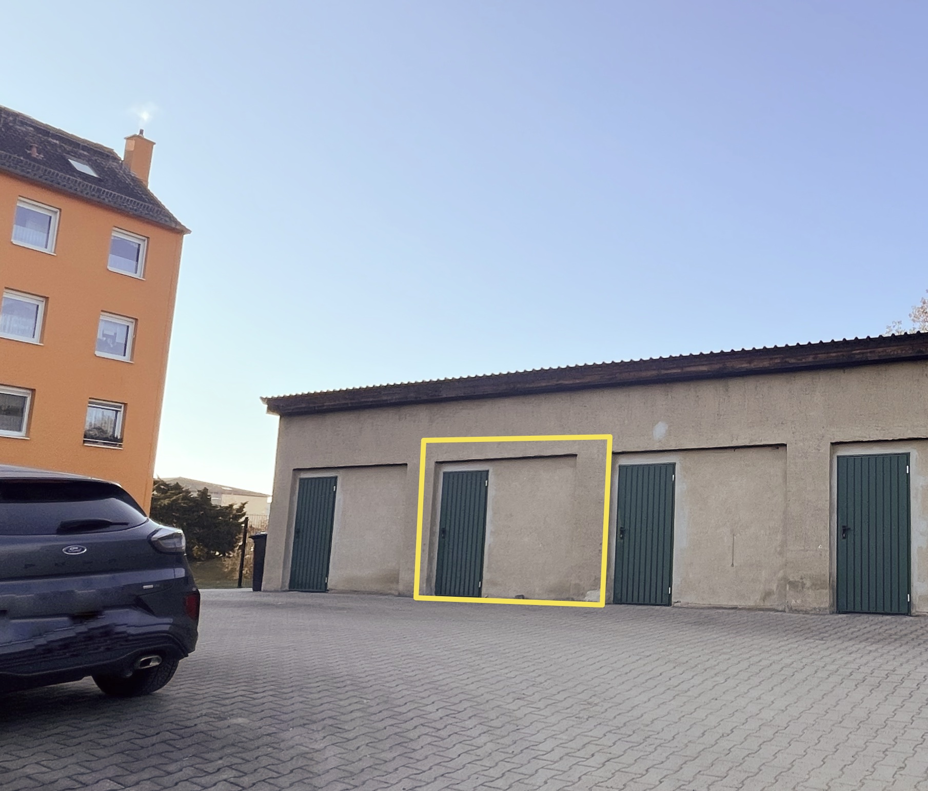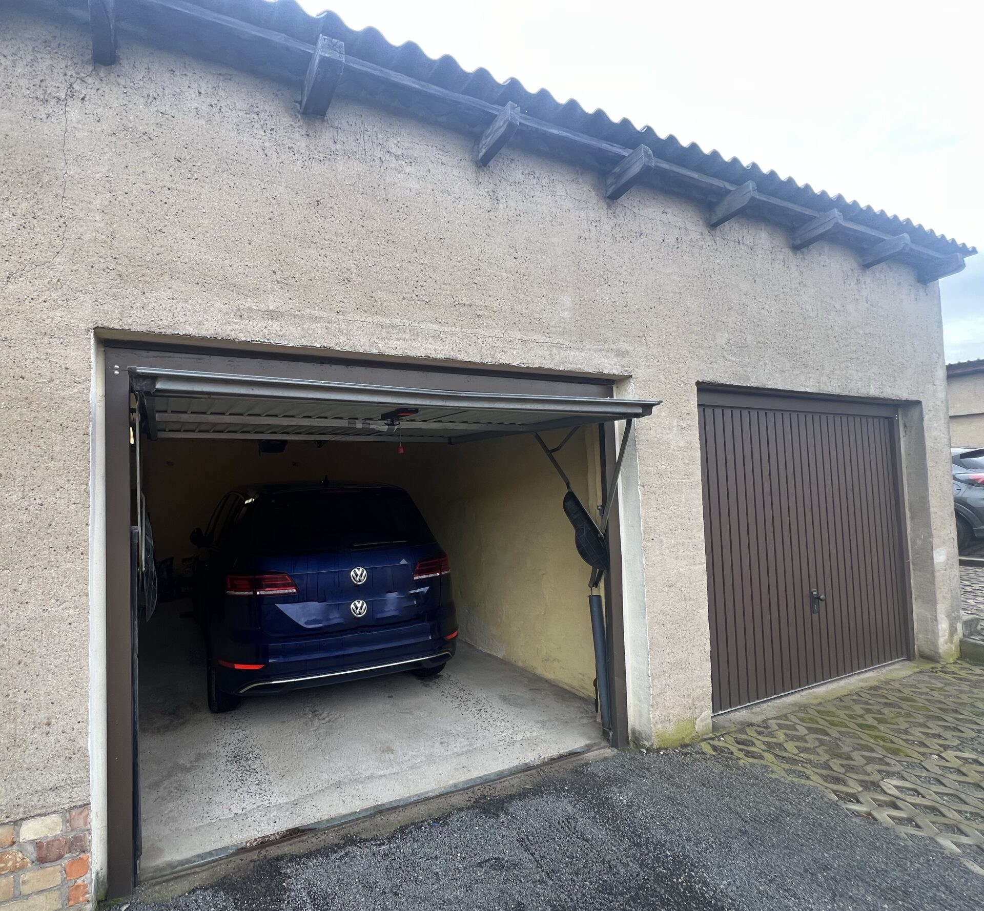 Die massiv gebaute Garage bietet Platz für einen Pkw. Das Schwingtor ist mit einem Elektroantrieb ausgestattet. Weitere Stellflächen sind im Bereich der öffentlichen Straße vorhanden.