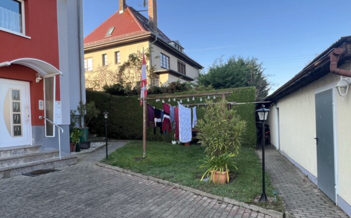 Für zusätzlichen Stauraum steht ein Abstellraum auf der halben Treppe, ein Kellerraum sowie die Hälfte des Dachbodens zur Verfügung. Bei Sonnenschein kann der Wäschetrockenplatz auf dem gepflegten Innenhof genutzt werden. Hier ist auch ein Bereich für die Mülltonnen sowie für Fahrräder vorhanden. In der Doppelgarage finden 2 PKW einen Stellplatz. Die Schwingtore sind elektrisch betrieben. Weitere Stellflächen stehen im Bereich der öffentlichen Straße zur Verfügung.