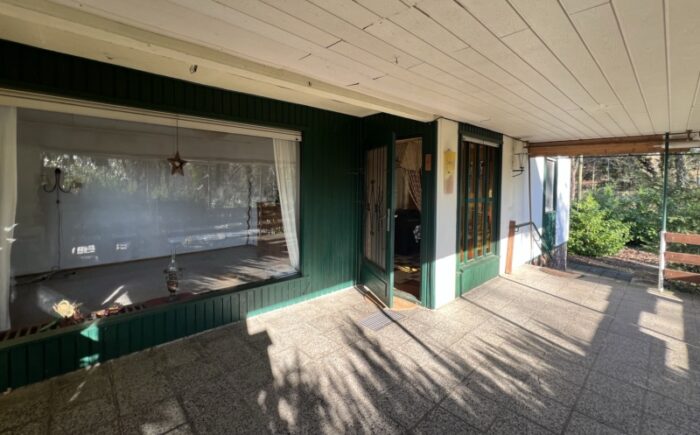 Aktuell ist das ortsüblich erschlossene Grundstück mit einem unterkellerten Fertigteil-Bungalow aus DDR-Zeiten, einer massiv gebauten Garage mit Zugang zum Keller sowie Nebengebäuden und einem Holzcarport bebaut. Auf einer Nutzfläche von ca. 44 m² sind im Bungalow zwei Schlafräume, ein Wohnzimmer, eine schmale Küche, ein Tageslichtbad mit Dusche, WB und WC sowie eine geräumige Diele mit Eingangstür vorhanden. Ausgestattet ist der Bungalow mit einer Zentralheizung auf Öl-Basis. Für zusätzliche Wärme sorgt ein Kaminofen. Die überdachte Terrasse ist nach Süden gerichtet und lädt zu gemütlichen Stunden mit einem herrlichen Blick in das traumhafte Waldgrundstück ein.
