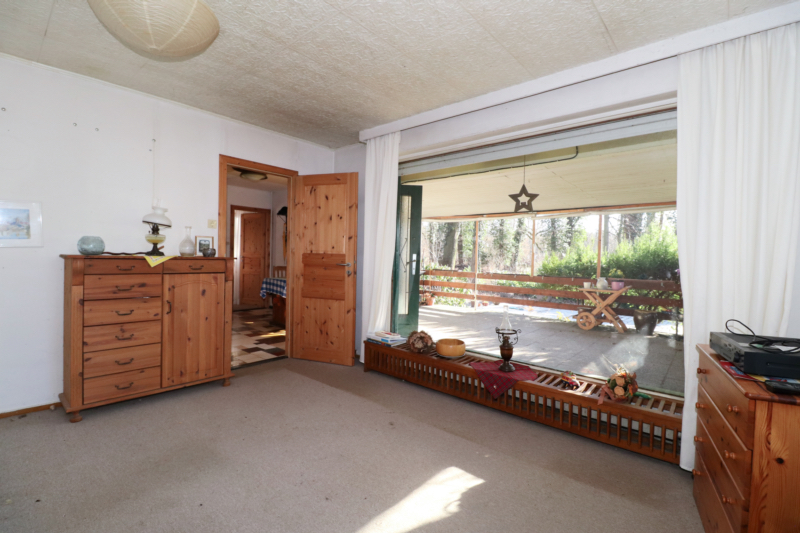 Aktuell ist das ortsüblich erschlossene Grundstück mit einem unterkellerten Fertigteil-Bungalow aus DDR-Zeiten, einer massiv gebauten Garage mit Zugang zum Keller sowie Nebengebäuden und einem Holzcarport bebaut. Auf einer Nutzfläche von ca. 44 m² sind im Bungalow zwei Schlafräume, ein Wohnzimmer, eine schmale Küche, ein Tageslichtbad mit Dusche, WB und WC sowie eine geräumige Diele mit Eingangstür vorhanden. Ausgestattet ist der Bungalow mit einer Zentralheizung auf Öl-Basis. Für zusätzliche Wärme sorgt ein Kaminofen. Die überdachte Terrasse ist nach Süden gerichtet und lädt zu gemütlichen Stunden mit einem herrlichen Blick in das traumhafte Waldgrundstück ein.