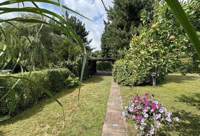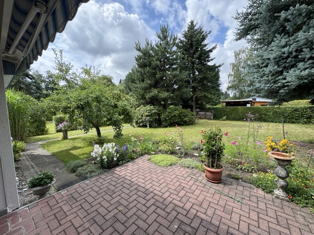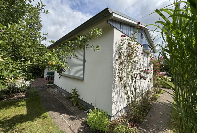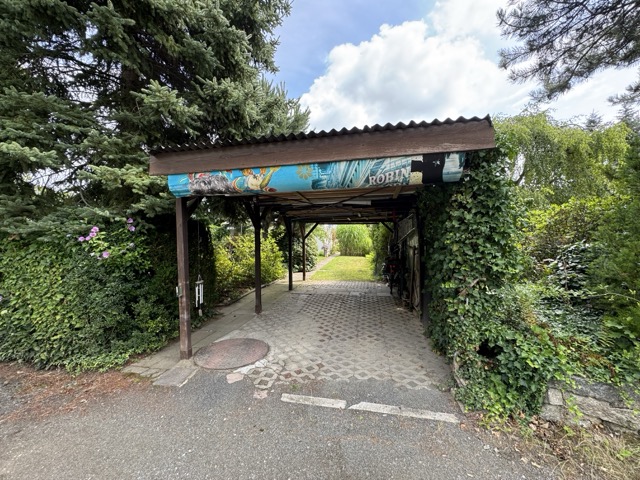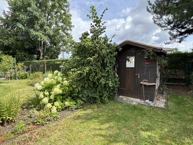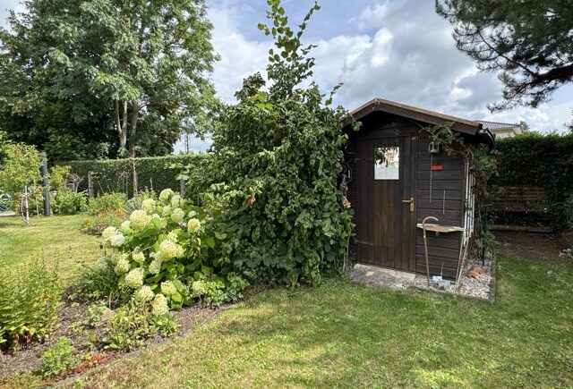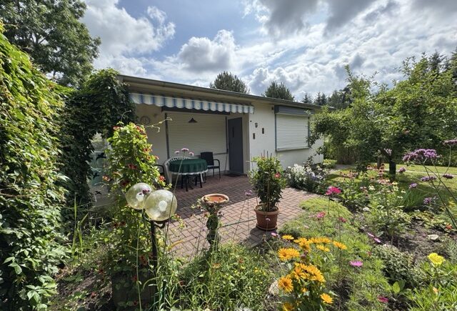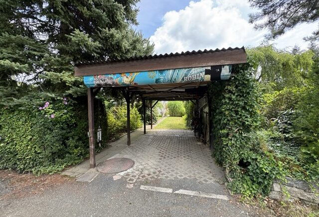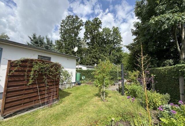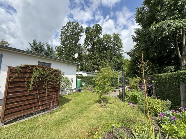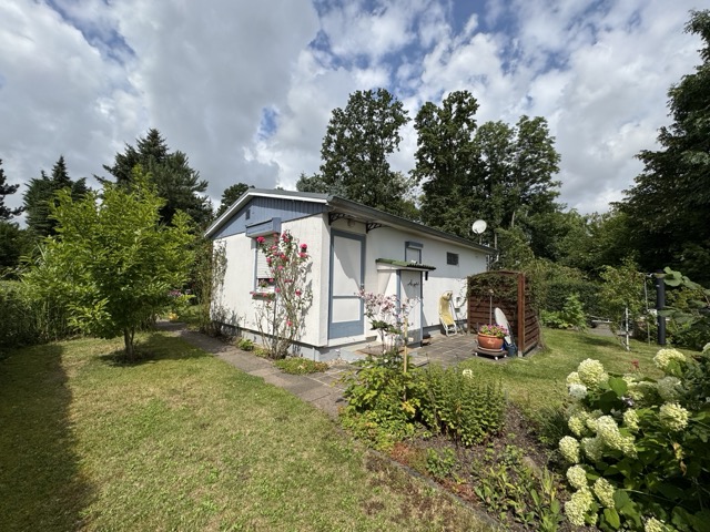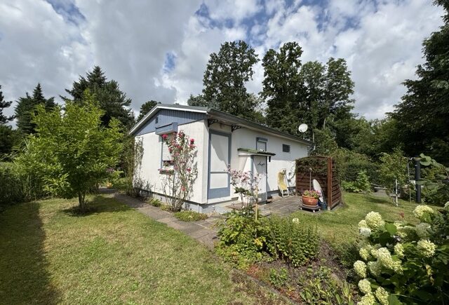 Bebaut ist das Grundstück mit einem nicht unterkellerten Wochenendbungalow mit einer teilüberdachten Terrasse, einem Carport aus Holz mit Stellplatz für 2 Pkw sowie einem zweckmäßigen Holzgartenhäuschen mit Stauraum für Gartengerät und Hobbybedarf. Das Objekt ist erschlossen – Strom, Trinkwasser, Schmutzwasseranbindung an die öffentliche Kanalisation – und kann ganzjährig (kein Dauerwohnsitz!) genutzt werden.