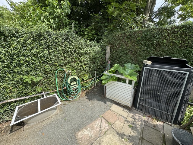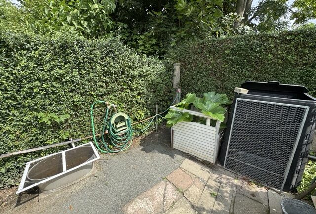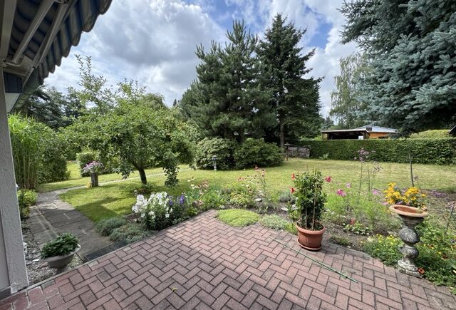 Die nach Süd ausgerichtete Terrasse wurde auf ca. 16 m² erweitert und lädt zu entspannten Stunden mit Familie und Freunden ein. Der Garten ist mit ausgewählten Ziersträuchern, Rasen, Hochbeet und Sichtschutzelementen pflegeleicht gestaltet. Für eine kühle Erfrischung an heißen Tagen sorgt eine moderne Außendusche.