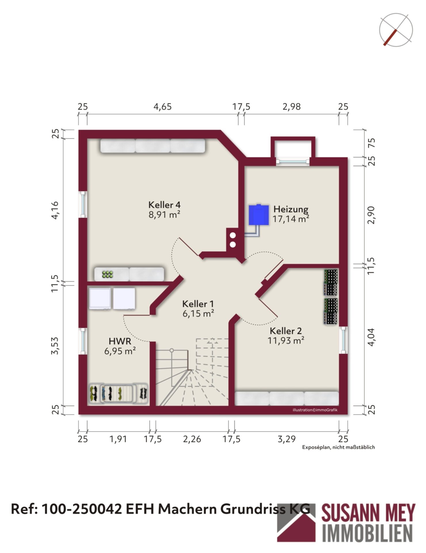 Besonders attraktiv ist das Kellergeschoss – hier befinden sich der HAR mit den Versorgungsanschlüssen sowie WMA/Trockner, ein Kellerraum mit der Heizungsanlage sowie ein Wohnkeller, welcher für Homeoffice, Gast oder als zusätzliches Schlafzimmer sehr gut geeignet ist.