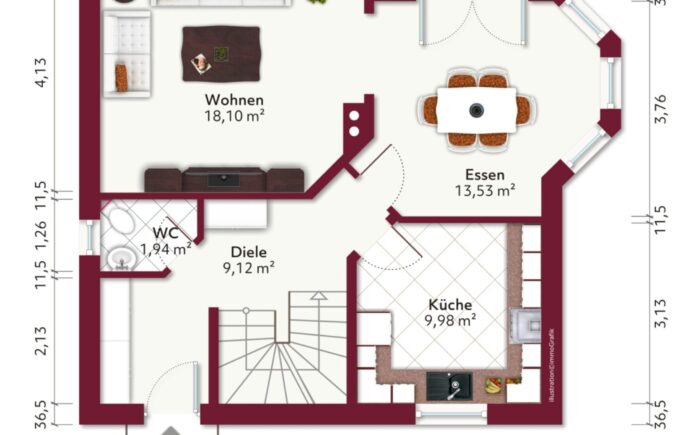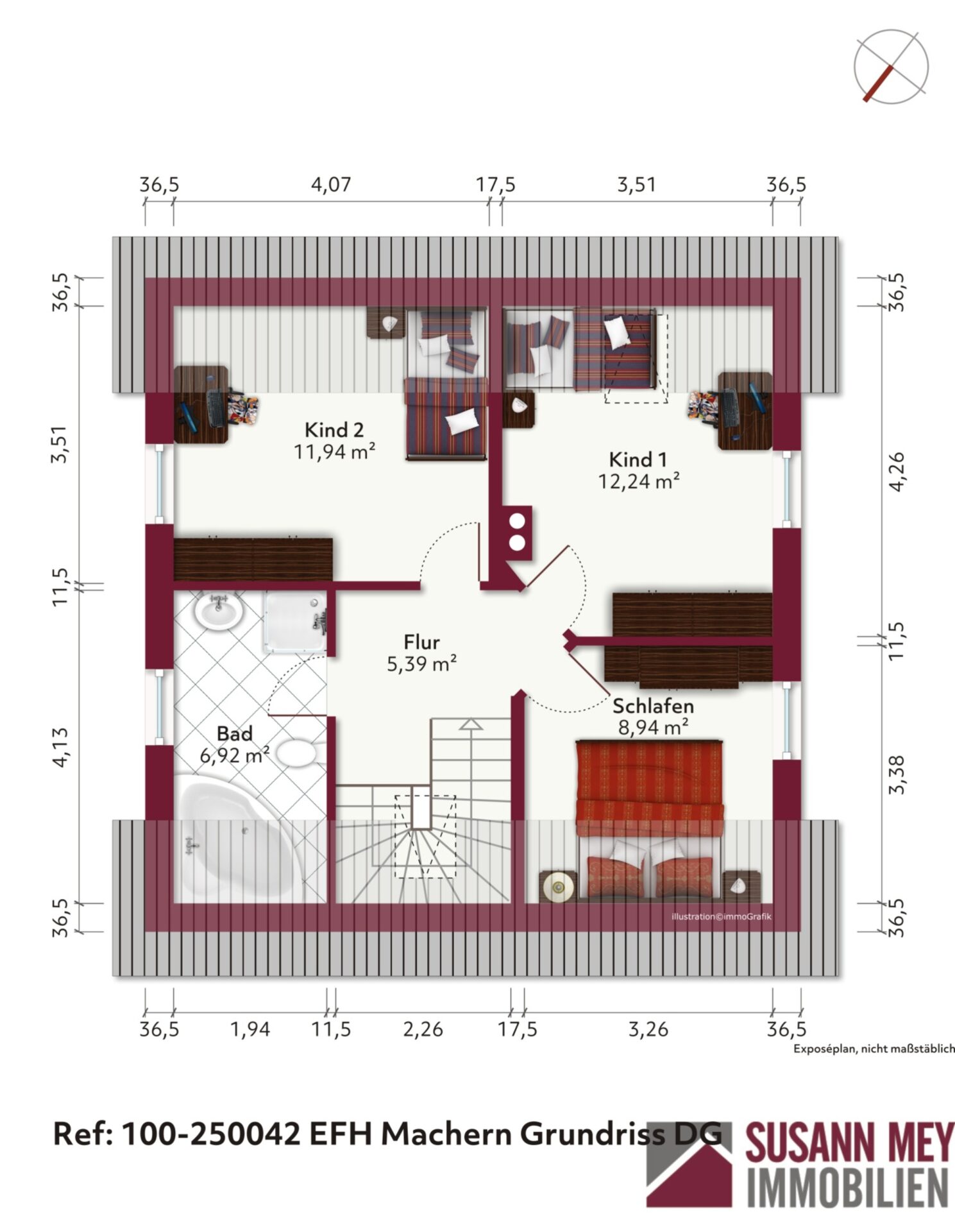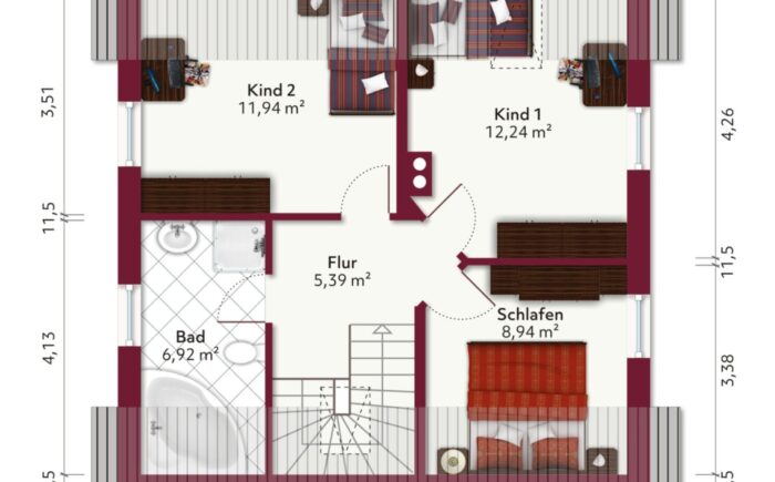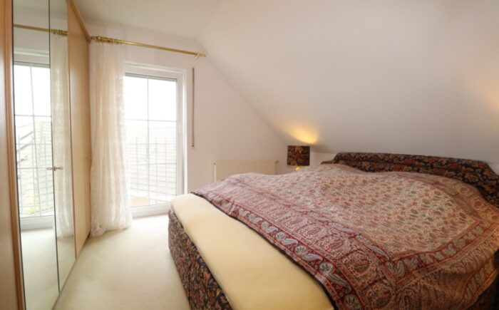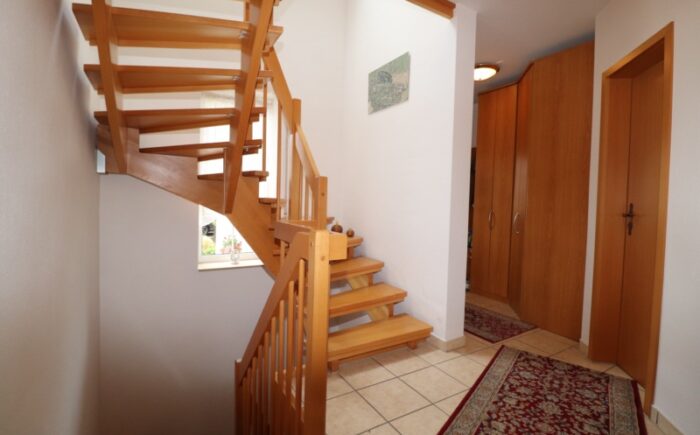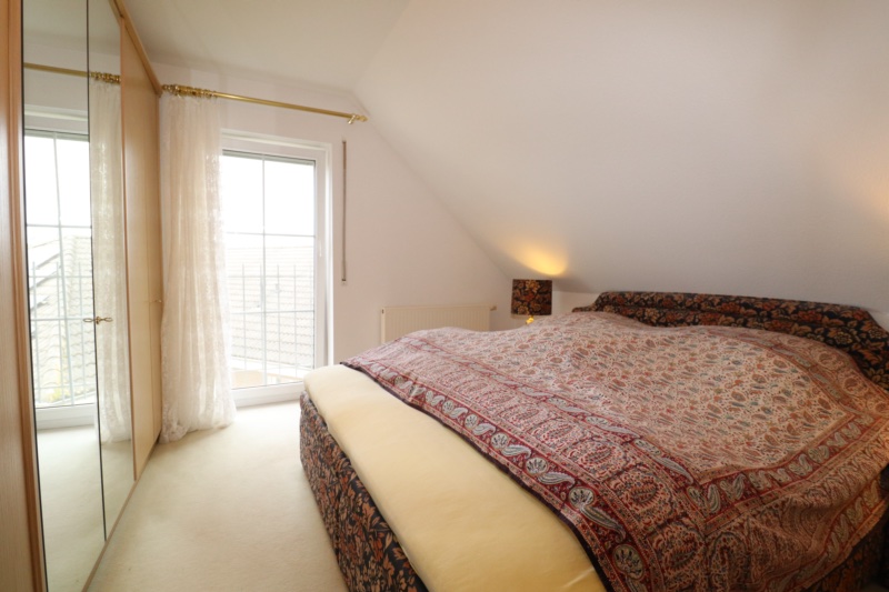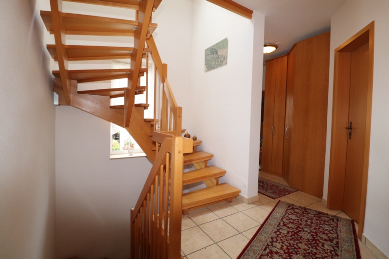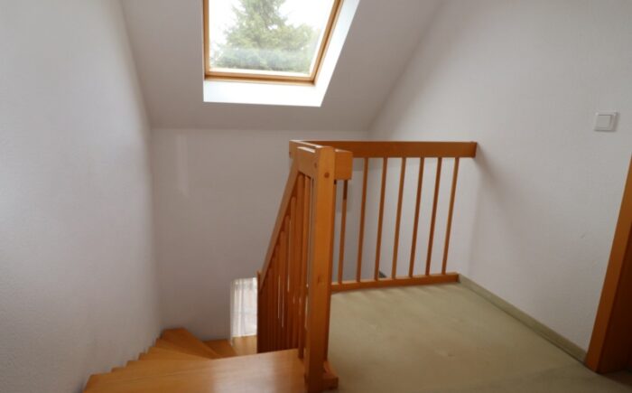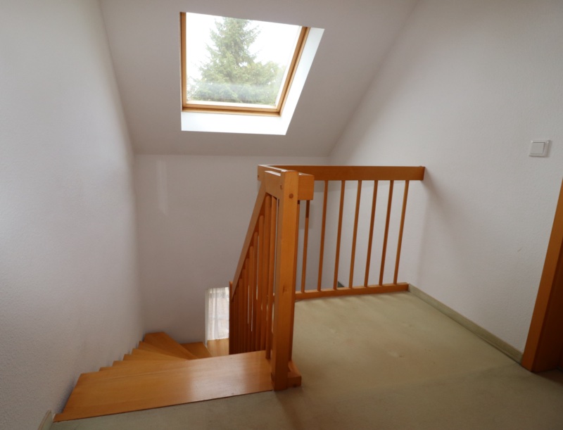 Die offene Holztreppe im Flur führt ins Dachgeschoss – von der Galerie sind das Schlafzimmer, das Familienbad mit Dusche und Wanne sowie 2 Kinderzimmer erreichbar. Das Objekt ist in einem sehr gepflegten Zustand.