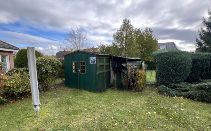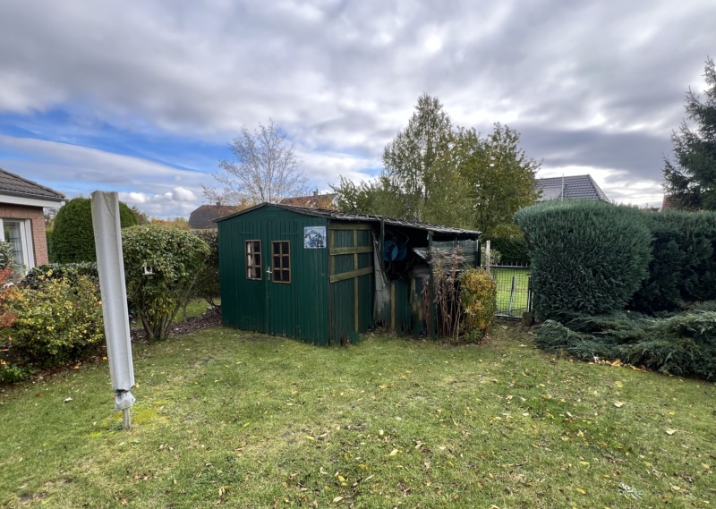 Der Garten ist geschmackvoll und pflegeleicht mit ausgewählten Sträuchern , Koniferen und blühenden Stauden angelegt und mit einem Holzgartenhaus als Stauraum für Hobby- und Gartengerät bebaut.