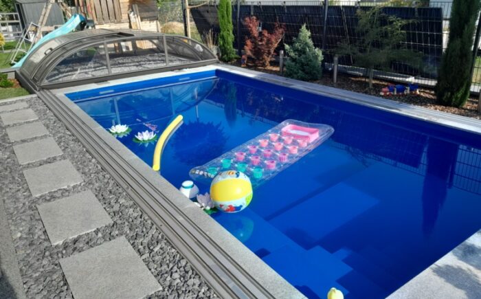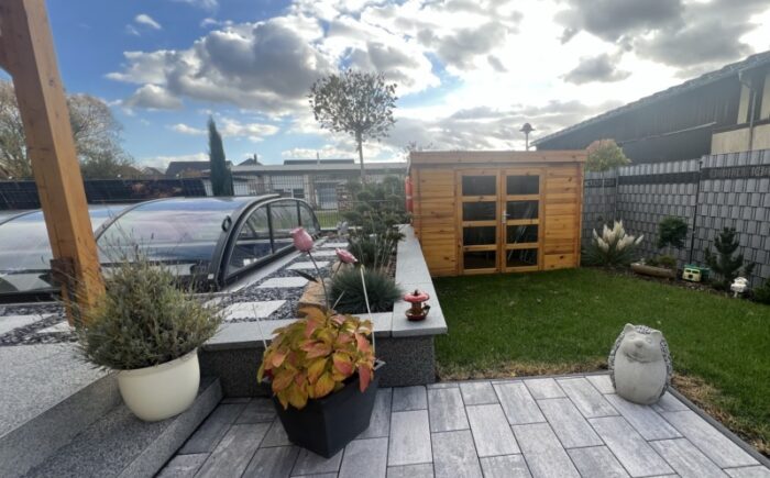 Der Außenbereich besticht durch eine große, sonnige Terrasse, die mit einer Echtglasüberdachung und Sonnenschutzlamellen ausgestattet ist und somit perfekte Rückzugsorte im Freien schafft. Ein überdachter Pool (3 x 6 m) lädt zu entspannenden Stunden ein, während die massive Garage mit elektrischem Sektionaltor und ein zusätzlicher Außenstellplatz praktischen Komfort bieten. Gepflasterte Gehwege führen durch den gepflegten Garten, der mit einem Holzgartenhaus für zusätzlichen Stauraum, ebenfalls überzeugt.