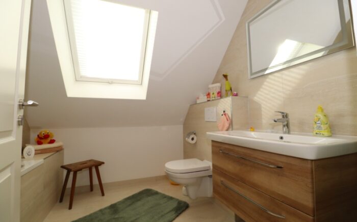 – Tageslichtbad mit Badewanne, WC und Waschtisch (Dachfenster mit elektrischer Außenjalousie)