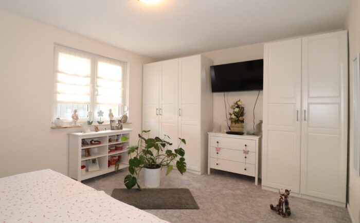 Die Ausstattung des Hauses lässt keine Wünsche offen: Weiße Kunststoff-Fenster mit Dreifachverglasung und Außenrollläden sorgen für optimalen Schallschutz. Die Dacheindeckung aus engobierten Tondachziegeln und die Fußbodenheizung im gesamten Haus garantieren ein angenehmes Raumklima. Die zeitgemäße technische Ausstattung mit Solar und Speichermodulen bieten zusätzlichen Komfort, Nachhaltigkeit und eine unabhängige, kosteneffiziente Unterhaltung.