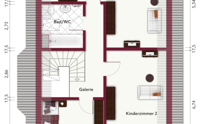 Im Dachgeschoss erwarten Sie drei helle Räume, die flexibel als Kinder-, Gäste- oder Arbeitszimmer genutzt werden können. Ein weiteres Tageslichtbad mit Badewanne, WC und Waschtisch rundet das Angebot in dieser Etage ab. Zusätzlichen großen Stauraum eröffnet der Spitzboden mit Zugang über eine aufklappbare Bodentreppe im Raum Kind 3.