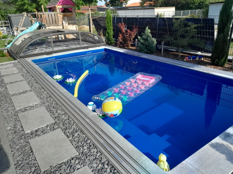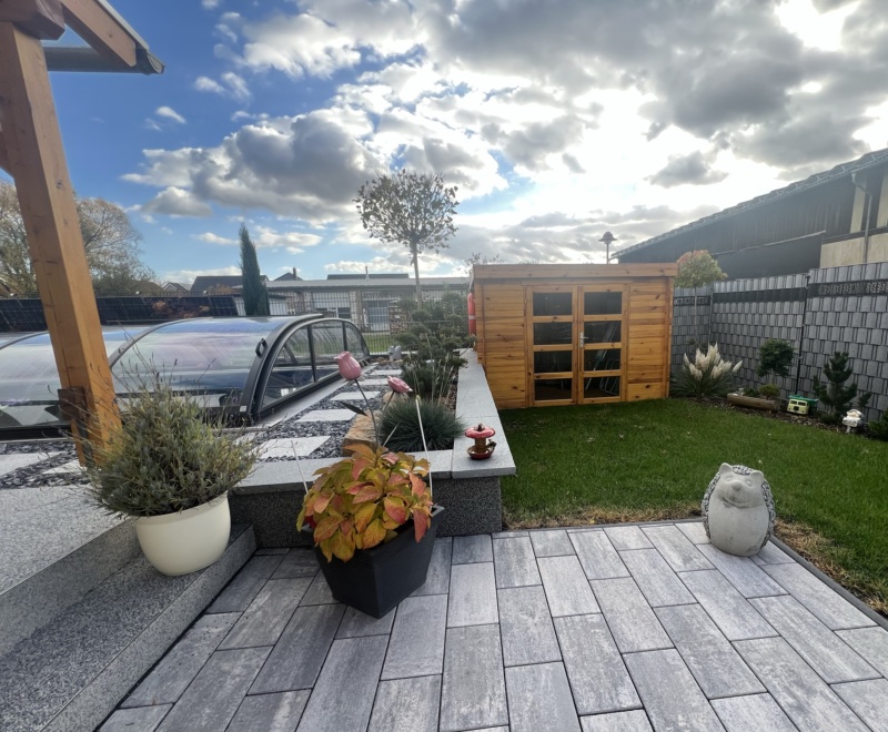 Der Außenbereich besticht durch eine große, sonnige Terrasse, die mit einer Echtglasüberdachung und Sonnenschutzlamellen ausgestattet ist und somit perfekte Rückzugsorte im Freien schafft. Ein überdachter Pool (3 x 6 m) lädt zu entspannenden Stunden ein, während die massive Garage mit elektrischem Sektionaltor und ein zusätzlicher Außenstellplatz praktischen Komfort bieten. Gepflasterte Gehwege führen durch den gepflegten Garten, der mit einem Holzgartenhaus für zusätzlichen Stauraum, ebenfalls überzeugt.
