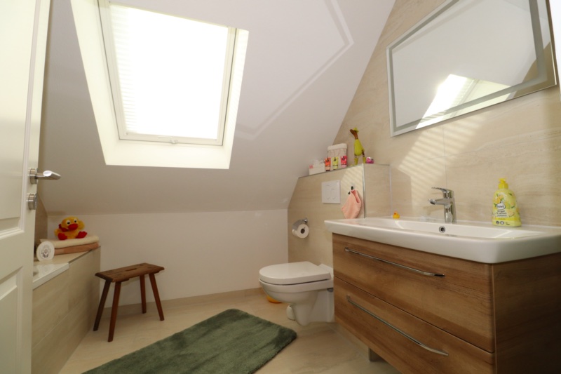 – Tageslichtbad mit Badewanne, WC und Waschtisch (Dachfenster mit elektrischer Außenjalousie)
