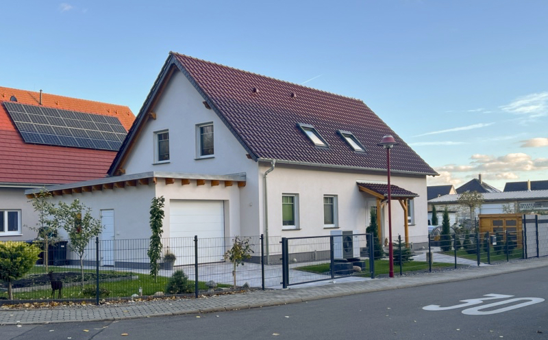 Die Ausstattung des Hauses lässt keine Wünsche offen: Weiße Kunststoff-Fenster mit Dreifachverglasung und Außenrollläden sorgen für optimalen Schallschutz. Die Dacheindeckung aus engobierten Tondachziegeln und die Fußbodenheizung im gesamten Haus garantieren ein angenehmes Raumklima. Die zeitgemäße technische Ausstattung mit Solar und Speichermodulen bieten zusätzlichen Komfort, Nachhaltigkeit und eine unabhängige, kosteneffiziente Unterhaltung.