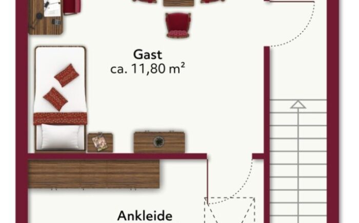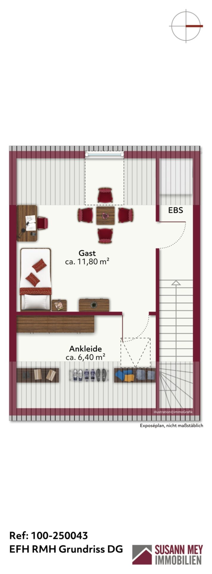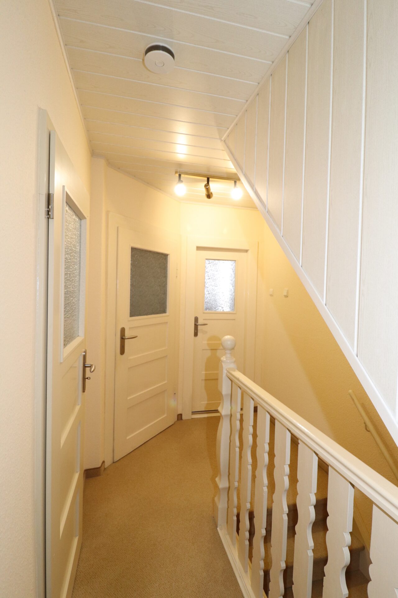Vom Flur führt der Treppenaufgang zum Dachgeschoss. Hier ist ein Gast, Kind oder Homeoffice Bereich mit Dachgauben-Fenster sowie ein zusätzlicher Raum als Ankleide oder Abstellraum vorhanden. Über einen Dachaufstieg gelangt man zum Spitzboden/Kaltdach.