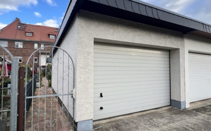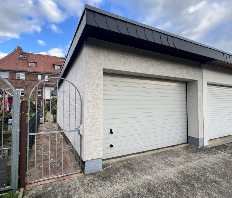 Die Garage für einen Pkw ist über einen gepflasterten Weg vom Garten erreichbar. Die Zufahrt erfolgt über den Kleeweg. Die massiv gebaute Garage ist mit einem elektrisch angetriebenen Sektionaltor ausgestattet und bietet weiteren Stauraum.
