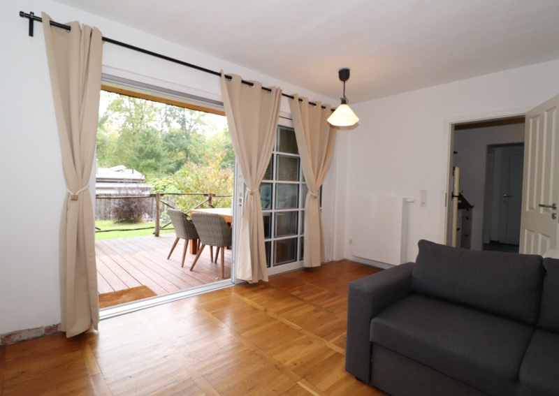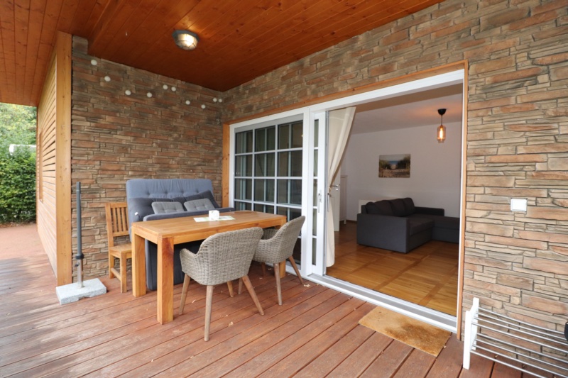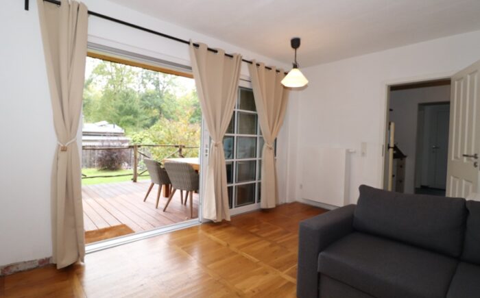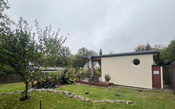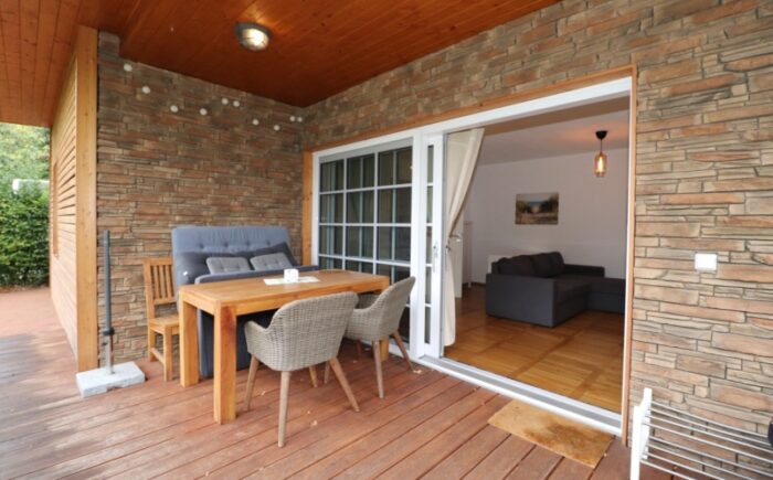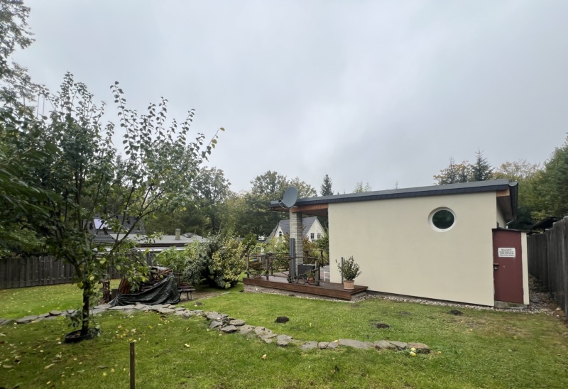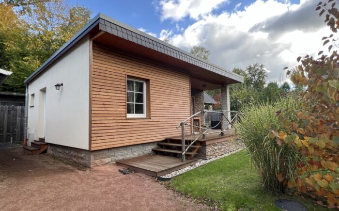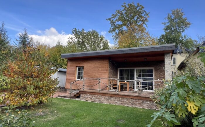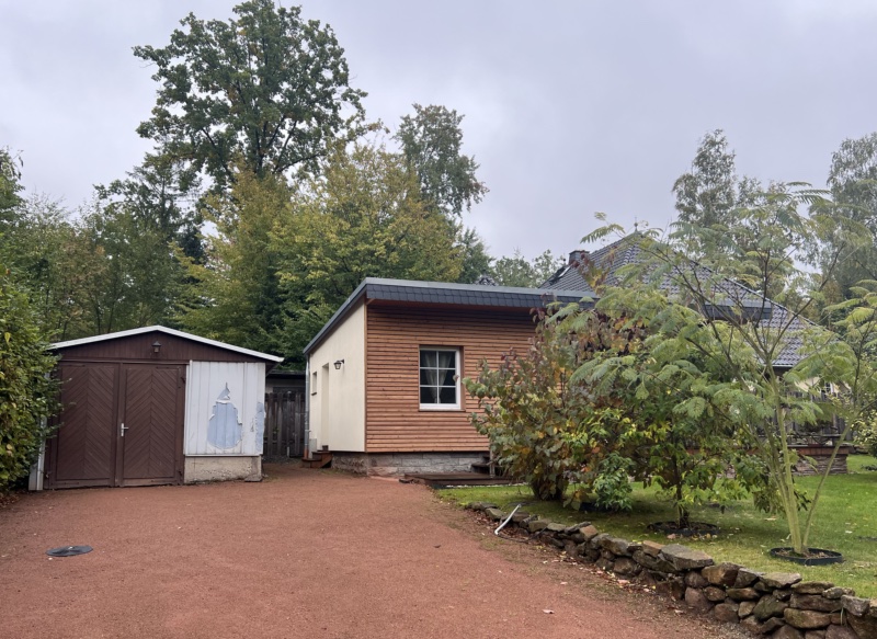 Bebaut ist das Grundstück mit einem massiv gebauten Wochenendbungalow mit einer großzügigen, teilüberdachten Terrasse und einer Garage. Der Bungalow wurde seit 2018 umfangreich saniert – Anschluss an Versorgungsmedien (Kanalisation, Glasfaser), Einbau neuer Fenster, Erneuerung der Elektroinstallation auf Kupfer, Bodenbeläge und Malerarbeiten sowie der Einbau eines modernen Tageslichtbades mit Fußbodenheizung, bodentiefer Dusche, WB und WC. Im Bungalow sind ein Schlafzimmer, das Bad, die Küche und ein geräumiges Wohnzimmer mit großer Fensterfront und Glasschiebetür vereint. Die teilüberdachte an das Wohnzimmer grenzende Terrasse mit ca. 20 m² Fläche lädt zu entspannten Stunden mit Familie und Freunden ein.